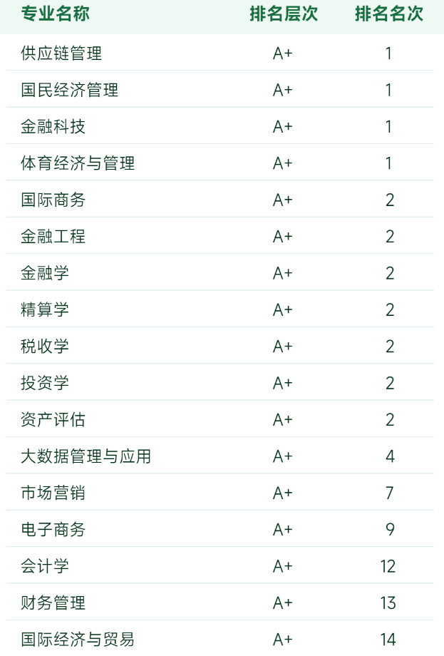 学院设有工商管理、市场营销(大数据营销)、人力资源管理以及供应链管理4个本科专业,均入选国家一流本科专业建设点。其中,市场营销(大数据营销)名列全国第4名;人力资源管理排名全国第10名;供应链管理连续多年获A+等级。