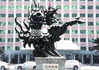 南路校区的主教楼前,正在腾飞的骏马驮着燃烧的太极球,意喻“龙马担乾坤”,展现着中财人的蓬勃生机与昂扬斗志。