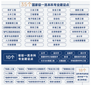 学校现有73个本科专业,35个国家级一流本科专业建设点,11个“教育部卓越工程师计划试点专业”和3个教育部综合改革试点专业。矿业类专业实力雄厚,百年来,为祖国培养出中国煤炭行业第一位中科院院士宋振骐、第一位工程院院士范维唐、香港地区第一位工程院院士陈清泉……